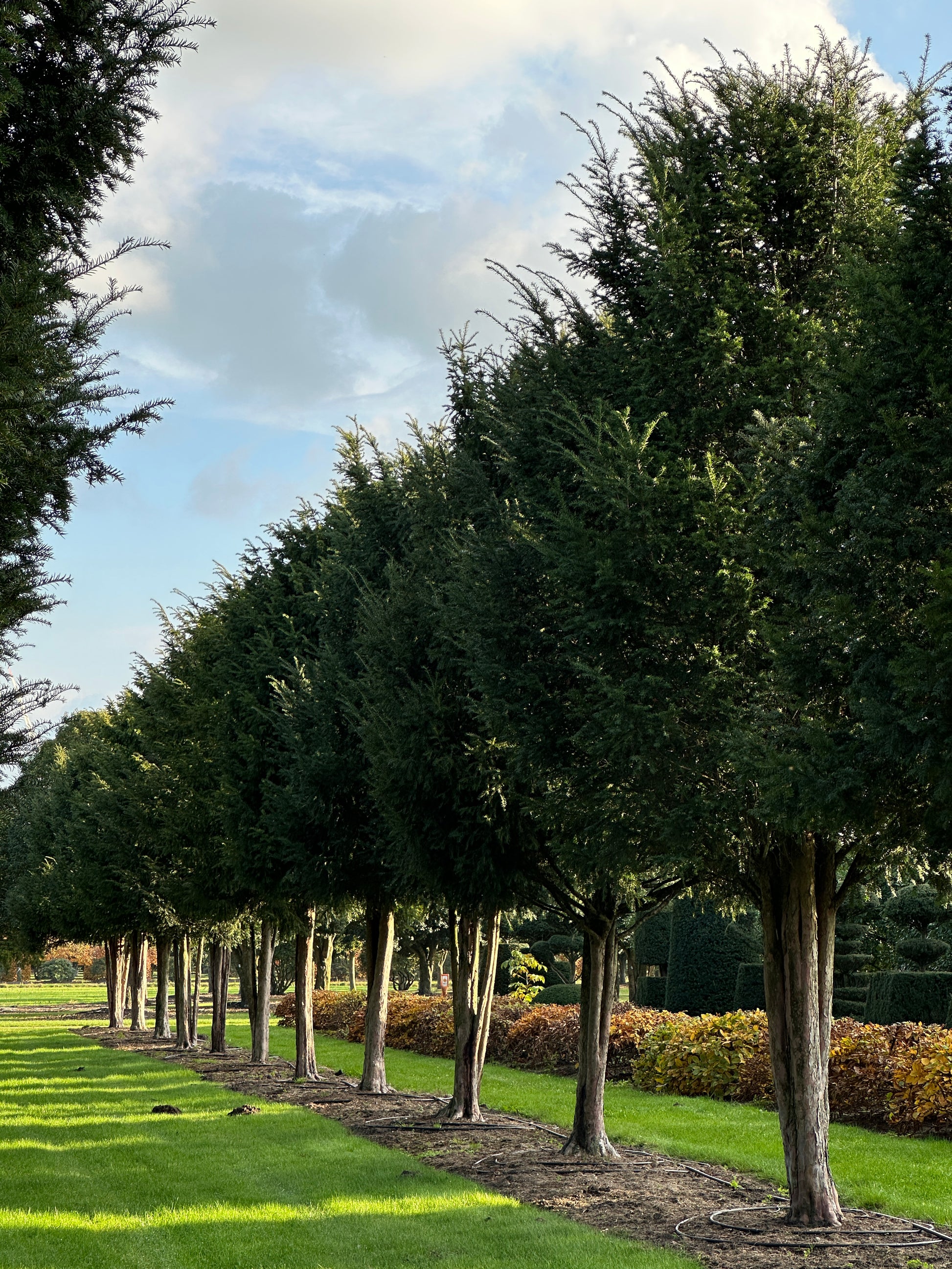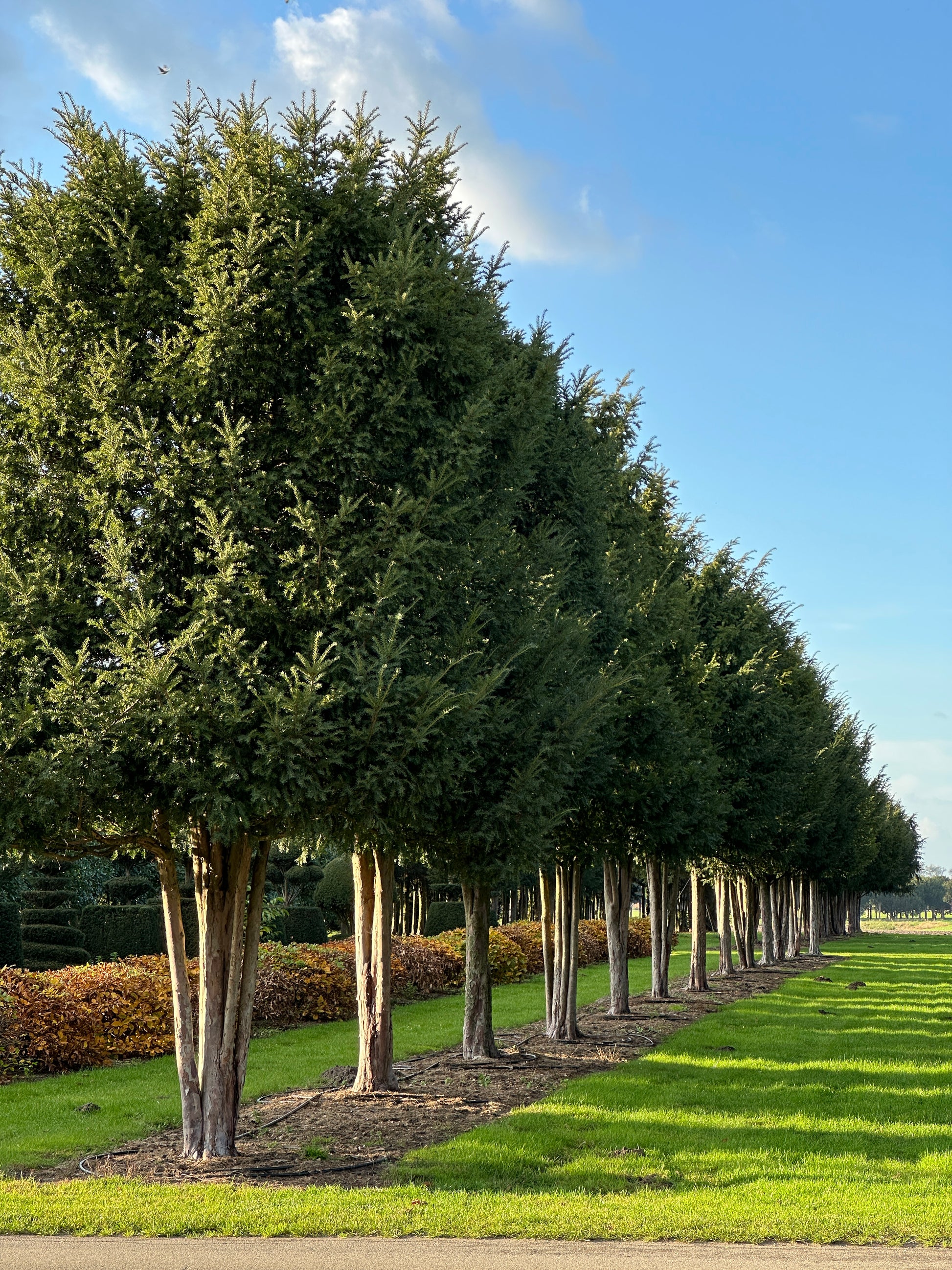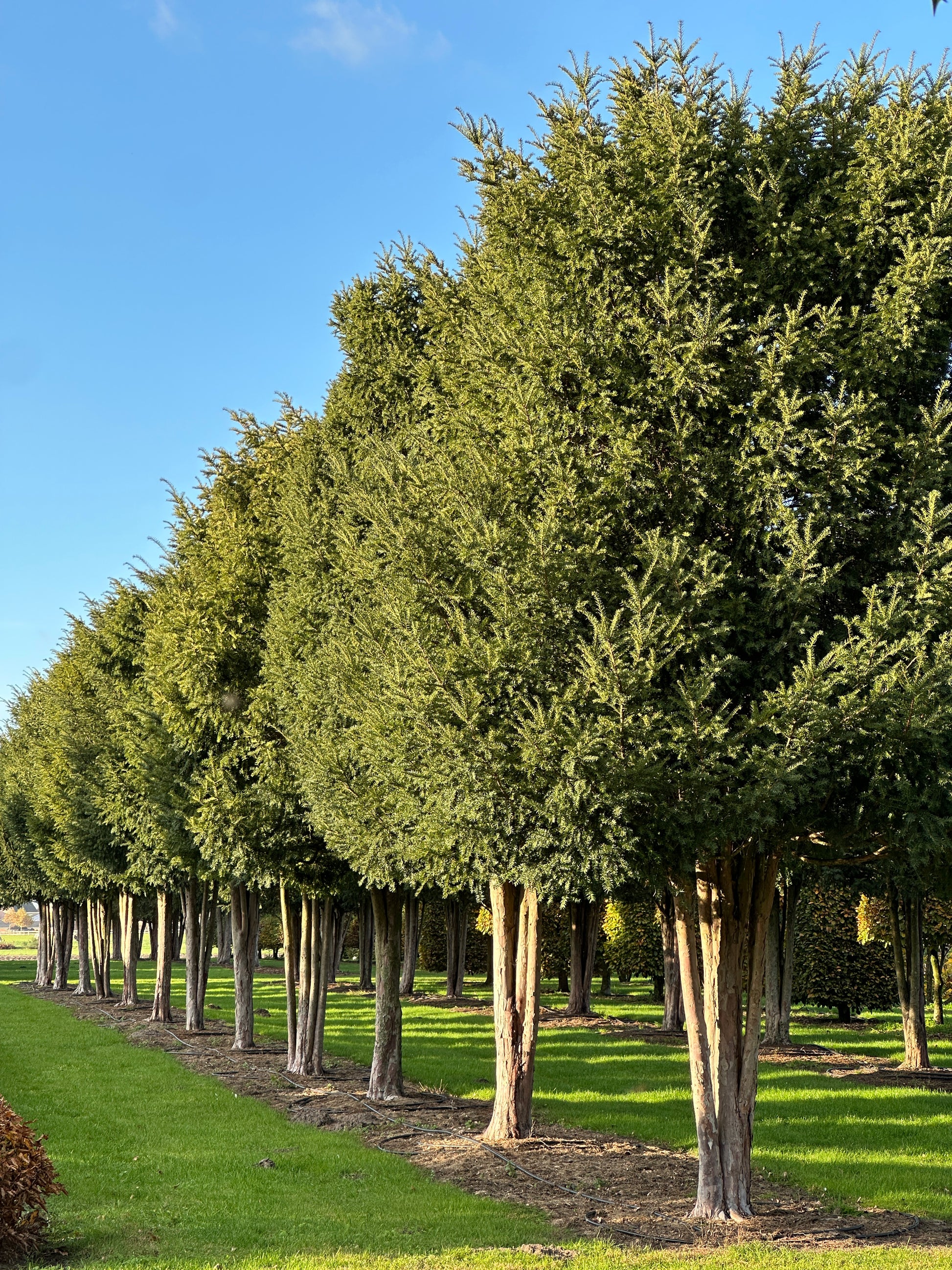 We proudly call these two rows of mature, multi-stemmed Taxus baccata our “avenue”! The 26 specimens each measure 500/600 cm in height and 300/350 cm in width, with stems around 200 cm tall. Because they have grown together from the very beginning, they match beautifully — which is why we would love to keep them as a group. They are perfect for creating your own avenue, for example, and are currently only sold per row.
